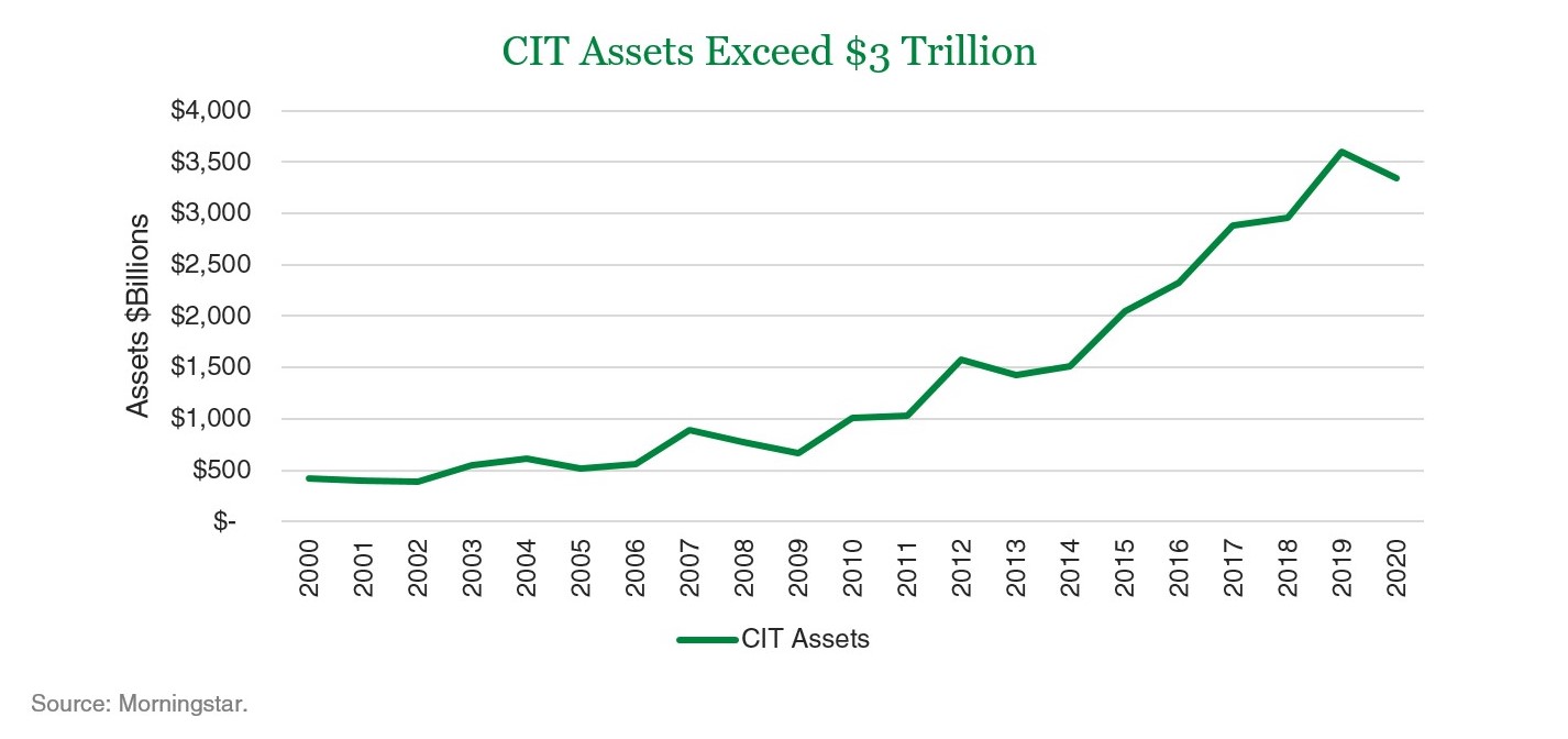 CITs were first launched in 1927 and were a popular choice among defined benefit plans for decades. When 401(k) plans were developed in the 1980s, CITs were an option in many of the early plans; however, given the operational constraints of CITs and their lack of widely available information, mutual funds soon became the preferred vehicle in most 401(k) plans. That said, CITs have undergone significant developments over the years, making them comparable to their mutual fund counterparts, while also offering distinct advantages.