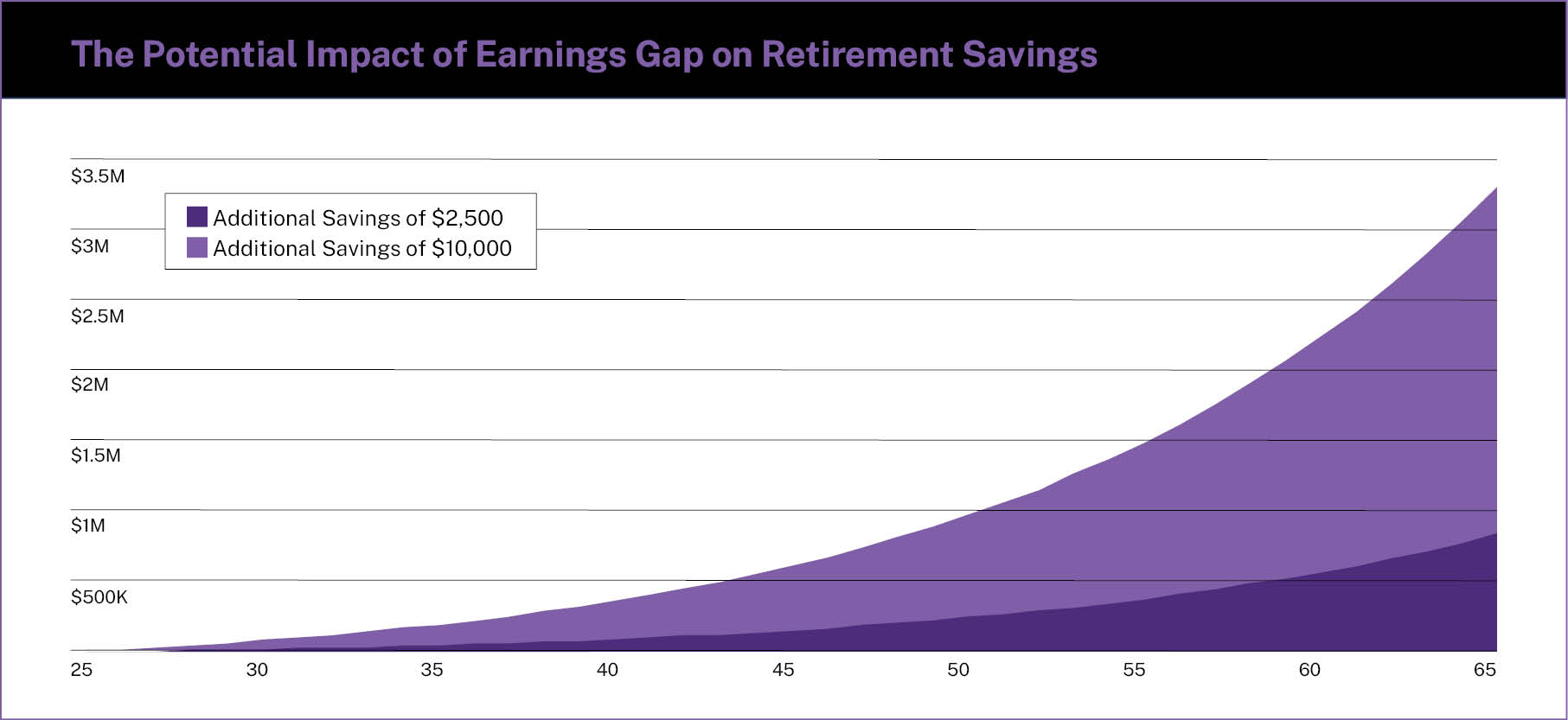 Not only is that a problem in and of itself, but it can have a noticeable impact on retirement savings. The 5% difference in wages alone, based on a job with an average starting salary of $50,000 at age 25 and assuming the difference – $2,500/year – is contributed to a retirement account growing at 7% a year, would result in over $780,000 in additional savings at age 65.