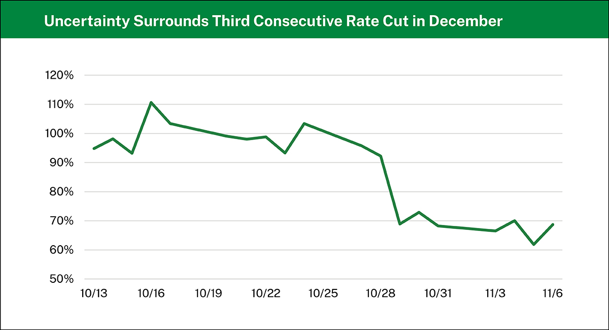 However, expectations for further easing quickly faded after Chairman Jerome Powell cautioned that a December rate cut was “not a foregone conclusion – far from it.” Before the meeting, markets had effectively priced another cut in December as inevitable, but odds have since dropped to near even, injecting fresh uncertainty into the final FOMC meeting of 2025.
