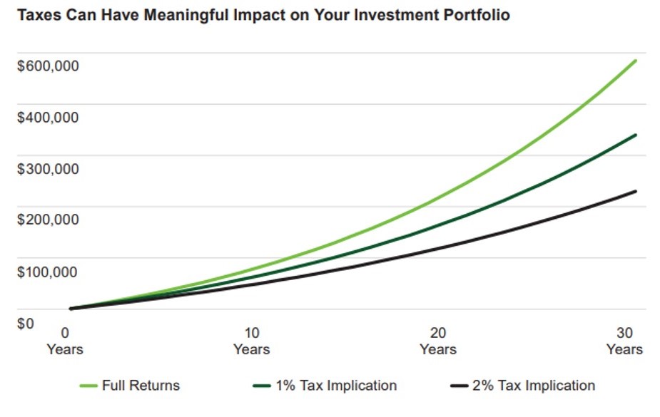 An investor can experience a substantial drag on performance, sometimes in a full percent or more, because of taxation. This concept is also known as a tax drag. Without proper strategy, you can end up realizing that tax implications can result in very materially less net worth that you otherwise could have.